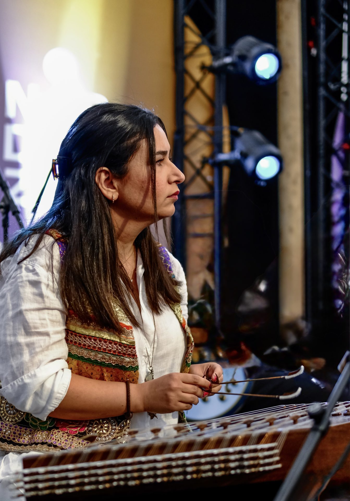 Maryam Movaffaghi Maryam is in Iraanske muzikante út Ljouwert dy’t de Santour bespylet: in ieuweâld Perzysk ynstrumint mei 72 snaren. Jûn lit se it ynstrumint yn syn puerste foarm klinke: akoestysk, yntym en rjocht út it hert.